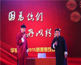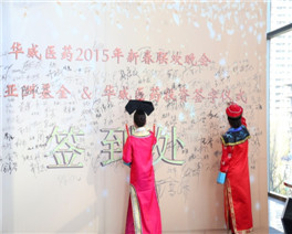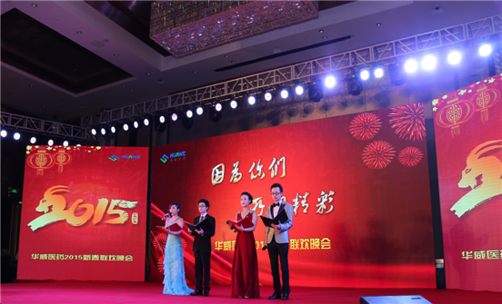 2015年2月8日,华威医药“因为你们•所以精彩”新春联欢晚会在南京金奥费尔蒙酒店隆重举行。下午16点整,南京市栖霞区委领导、江苏生命科技创新园管委会领导、江苏高科技投资集团领导、礼来亚洲基金领导及华威医药全体同仁共250余位嘉宾出席华威医药年度盛宴。在晚会主持人的新春祝福声中,与会嘉宾共同观看了“我们的2014”开场视频,共同分享和回顾了华威医药2014年度在各方面取得的优异成绩和精彩瞬间。