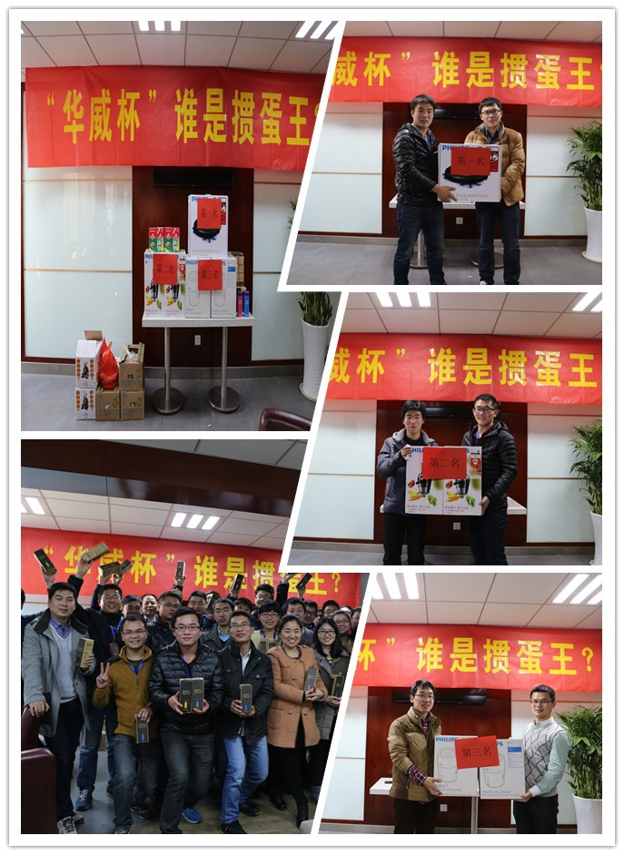 为迎接2016年新春,丰富员工业余文化生活,提高职工团队协作意识,促进职工之间的相互交流,公司特举办“华威杯”迎新年掼蛋大赛。比赛由员工自由组合和配对,共48对选手参与了比赛。本着友谊第一,比赛第二的精神,比赛现场既有紧张的比赛氛围,也充满了欢声笑语。经过40余场的激烈角逐,来自合成三部的贾凯、宁朋获得了第一名,来自合成六部的沈东、于智宇获得了第二名,来自合成三部的赵冬冬、程奇获得第三名。