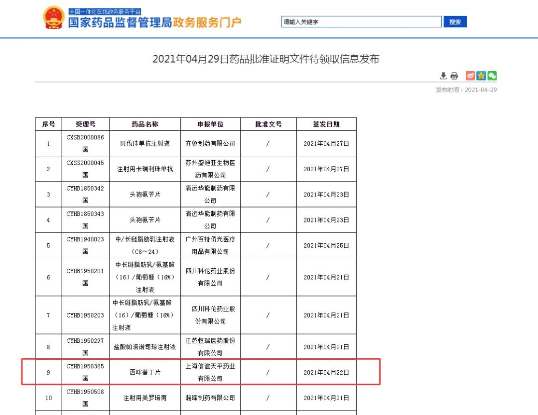 2021年4月22日,国家药品监督管理局正式发布通知,华威医药受上海信谊天平药业有限公司委托的西咪替丁片项目正式通过仿制药质量和疗效一致性评价。值得关注的是,这是国内第二家通过西咪替丁片的企业。